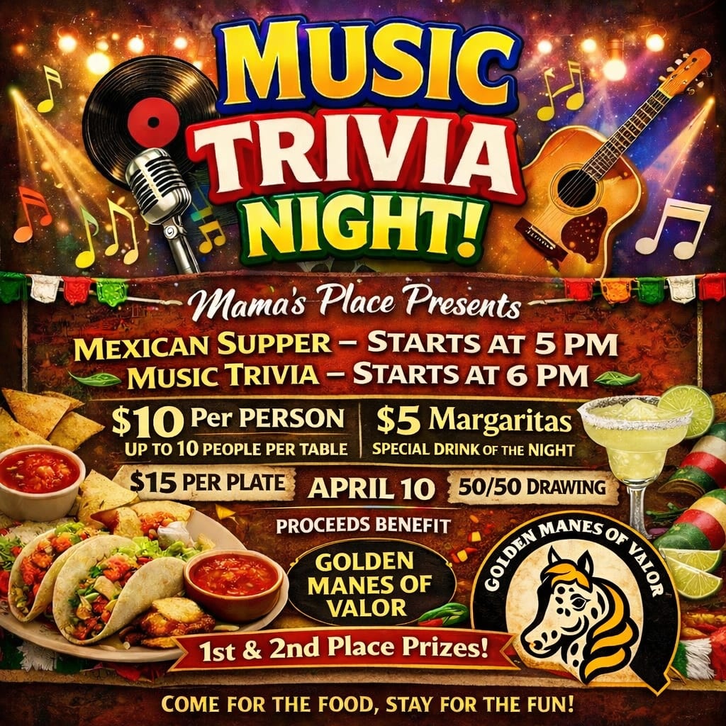 Join Mama's Place on April 10, 2026 for an exciting evening! Mexican Supper starts at 5 PM, Music Trivia starts at 6 PM. Enjoy delicious Mexican food, compete in music trivia, and support Golden Manes of Valor! Come for the food, stay for the fun! Proceeds benefit Golden Manes of Valor.